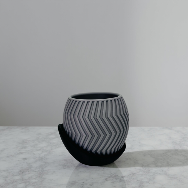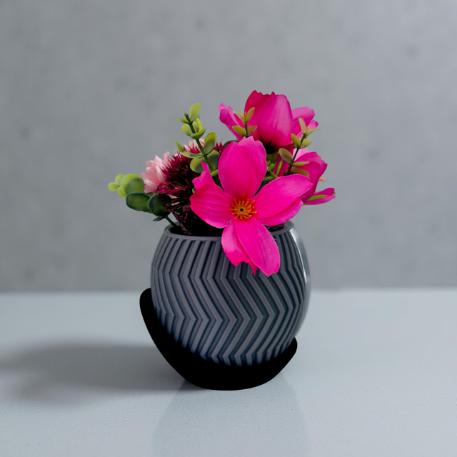 This 3D Printed Titled Chevron Planter features a modern grey design complemented by a black water tray, ideal for both live and artificial plants.