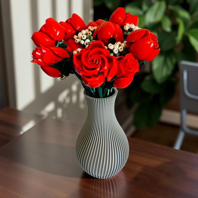 This Grey Ribbed vase, expertly 3D printed, is designed to perfectly accommodate Lego flowers or artificial flowers.