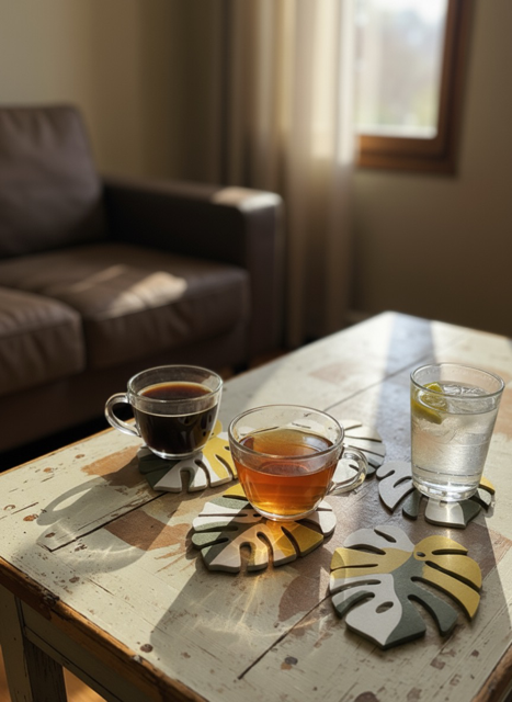 This Green Monstera Coaster Set features a pink floral pot with sturdy, 3D-printed construction.